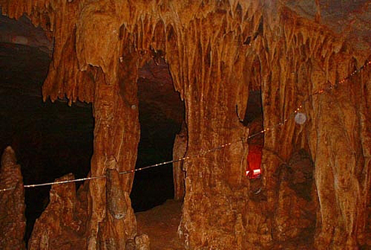 | 藏君洞為一大型天然溶洞,溶洞長25000米,已探明洞長4000m,洞內(nèi)洞中有洞、洞中有河,迂回曲折,地下河流水潺潺,溶洞分布在石炭系中、上統(tǒng)碳酸鹽巖中,洞內(nèi)鐘乳石十分豐富:石筍、石柱、石幔、石樓、石像比比皆是。洞內(nèi)構(gòu)造奇特,石鐘乳千姿百態(tài)、絢麗多彩,景觀奇秀,珍品奇絕,是我國少有的大型碳酸鹽巖巖溶洞穴之一。目前已開發(fā)的4000m洞穴中,由十二個大的溶洞群構(gòu)成,由洞口往里有護君堂、惠帝殿、兩重天、南巡廳、不夜城、龍鳳宮、北國廳、江南廳、江河壩、閱兵場、國寶廳等溶洞景觀區(qū)。溶洞一般高5~30m,長60~100m,寬10~20m,面積60~200㎡。十二個溶洞沿地下河呈串球狀分布,洞與洞之間有巷道(地下河管道)相連,溶洞中景觀十分豐富,仿佛是一個瑰麗的地下宮殿。如護君堂內(nèi)有“尚書帽”、“御馬”、“貓頭鷹”、“小羊羔”、“老夫妻”、“天宮浴盆”等景點,惠帝殿內(nèi)由“斷劍石”、“龍椅”、“觀音立佛”、“觀音蓮花寶座”等,“蔬果長廊”中有形似花菜、白菜、絲瓜、茄子、黃瓜等石筍,不夜城內(nèi)有乳白色石鐘乳巖溶坡面,龍鳳宮內(nèi)有石幔、石柱琳瑯滿目及鐘乳石構(gòu)成的似漢白玉“龍鳳石床”、“旭日東升”的浮雕石鐘乳墻、“燈籠群”、“攀龍柱”、“石蓮花”等,國寶廳巨型石柱等,巷道側(cè)壁唐僧師徒“西天取經(jīng)”壁畫等,景觀類型齊全,是巖溶洞穴中具有典型地學意義的巖溶地貌景觀,屬國家級的地質(zhì)遺跡景觀。