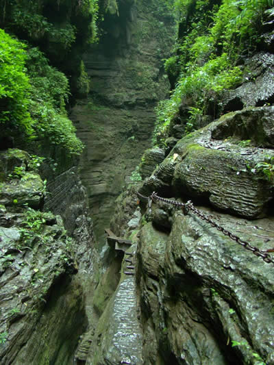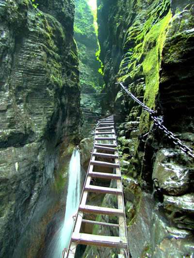 坐龍峽風(fēng)景區(qū) 坐龍峽擁有中國第一條特種游道。所有游道均建于峽谷深處,依山取勢,既經(jīng)細(xì)心雕琢聽卻又渾然天成。粗樸的板栗木棧道,可以讓你零距離的親近那一潭碧幽、聽聞山泉叮咚;精巧的跳墩,可以讓你媳戲流泉、觸感溪瀑;原質(zhì)的石坎道,讓你不得不調(diào)動全部的身心能量悉心攀援、感悟峽谷;有驚無險(xiǎn)的鐵梯,讓你伴著腳下轟鳴的溪水,在驚怵中體味一份快慰。出口處的土家山寨,保留了古樸獨(dú)特的生活習(xí)俗。一塊臘肉就一口醇香的“苞谷燒”會讓你洗去所有的疲憊,在輕松中憨厚的主人向你講述過去強(qiáng)人出沒的故事......