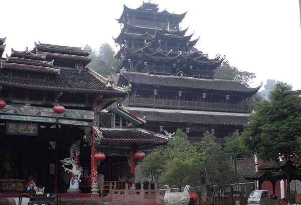 土司城 土司制度初建于五代十國(guó)時(shí)期,到了明朝己非常成熟了,土司王有無(wú)上的權(quán)威,在湘西有三大土司王分別是桑植土司向氏、永順土司王彭氏、慈利土司王張氏,其中又以永順溪州土司彭氏實(shí)力最強(qiáng)。其它土司王都為自己修建一座土司城,唯有彭氏分別在永定、永順修建了二座土司城。在永定的土司城內(nèi),彭氏為顯示其地位,修建了湘西最高的一座高達(dá) 48米,共12層的吊腳樓,整棟樓竟無(wú)一根鐵釘,堪稱土家吊腳樓建筑史上的奇跡,此樓于2002年9月被評(píng)為最高吊腳樓,榮獲世界吉尼斯之最,與此同時(shí)土司城內(nèi)舉辦一千人參加表演的毛古斯舞蹈活動(dòng)獲得圓滿成功,同時(shí)獲得世界吉尼斯之最。進(jìn)入土司城,首先看到土司城迎賓儀式,土家漢子迎賓鼓,吹牛角、放沖,土家姑娘攔門歌,敬攔門酒,進(jìn)入城內(nèi),在祭祀堂前舉行百人土家大祭祖活動(dòng),男女老少唱擺手歌、跳擺手舞,登世界最高的吊腳樓九重天,參觀土家族千百年來(lái)文化展示。到土家山寨,聽(tīng)土家歌,賞土家族最有代表風(fēng)俗哭嫁,三棒鼓,花燈等民俗表演。