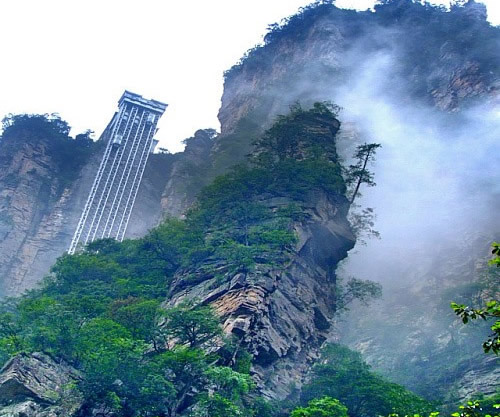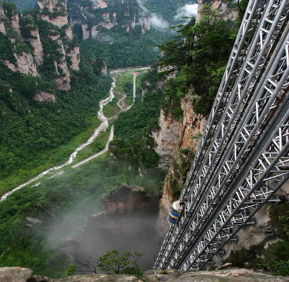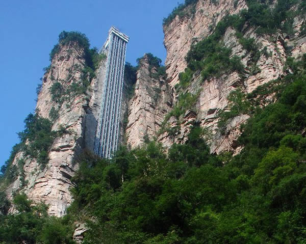 百龍電梯圖片 百龍?zhí)焯輾鈩莼趾,垂直高?35米,運行高度326米,由154米山體內(nèi)堅井和172米貼山鋼結(jié)構(gòu)井架等組成,采用三臺雙層全暴露觀光電梯并列分體運行,每臺次載客50人次,運行速度3米/秒,三臺同時運行每小時往返量達4000人次。百龍?zhí)焯莸男藿▽崿F(xiàn)“山上游,山下住”的目標(biāo),提供了交通保障,將袁家界天下第一橋、迷魂臺、天懸白練以及烏龍寨、楊家界等絕世美景從幕后推向了前臺,并將天子山、袁家界、金鞭溪等精品旅游線路連為一體,解決了多年困擾景區(qū)的交通瓶頸問題。