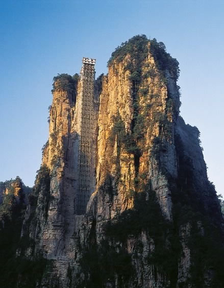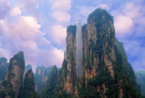| 百龍?zhí)焯菀挥谑澜缱匀贿z產(chǎn)張家界武陵源風(fēng)景名勝區(qū),1999年9月動工,2002年4月投入營運,電梯的主要設(shè)備由德國知名電梯公司研究生產(chǎn),耗資人民幣1.8億元,被譽為“世界上最高、運行速度最快、載重量最大的電梯”,也因此被載入吉尼斯世界紀錄。