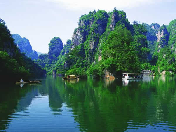 寶峰湖瀑布 湖中有兩座疊翠小島,近岸奇峰屹立,峰回水轉(zhuǎn)。泛舟漫游,只見一湖綠水半湖倒影,充滿詩情畫意。“云梯萬丈上天臺(tái),高峽平湖一鑒開,王母瑤池金扶,浣沙仙女下凡來”游寶峰湖,你就會(huì)欣賞到這樣的詩情畫意。群峰擁抱的寶峰湖,長(zhǎng)約2.,5公里,湖猶如一面寶鏡,四面青山,一泓碧水,蕩槳溫游,格外愜意。坐在船上,環(huán)顧四周,千山聳翠,俯視水中,倒影慢移,碧水照相館得群峰綠,人面桃花水映紅。真是靜極了,美極了!韓劇《九天洞》拍攝的湖水就是寶峰湖。