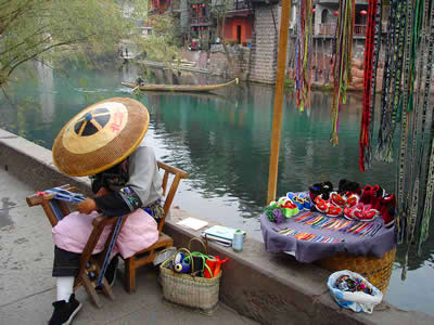 刺繡 刺繡。是土家姑娘在直紋平布上,按照布紋的經(jīng)緯和預(yù)先繪畫(huà)的花樣與底色不同的絲線繡成圖案。舊時(shí)姑娘們穿的繡花衣服,繡有服飾花邊、胸花、帽花,此外繡花枕頭、繡花荷包等也是精巧的手工工藝品。土家刺繡在配色上有自己的講究與習(xí)慣,一般選用青、藍(lán)、大紅等深色布料作底布,用淺色繡線制作圖案,或者相反,兩種用法的結(jié)果使繡品顯得質(zhì)樸逼真,色澤鮮艷,對(duì)比強(qiáng)烈。傳統(tǒng)圖案有“花開(kāi)富貴”、“龍鳳呈祥”、“鴛鴦戲水”、“喜鵲鬧梅”、“松鶴同壽”等,分室內(nèi)、衣著、工具、行李裝飾等多種種類。在景區(qū),土家婦女邊繡邊賣的精美鞋墊,深受海內(nèi)外游客喜愛(ài)。