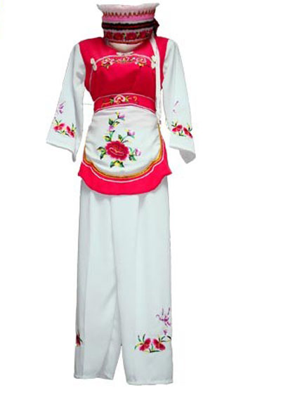 “崇尚白色”是白族人的一個(gè)明顯特點(diǎn)。不論男女都愛(ài)穿白色服飾,故有“要得俏,一身孝”之說(shuō),過(guò)去穿戴的白布又稱(chēng)“家布機(jī)”,是白族人自己種棉花,自己紡紗,自己用土機(jī)織,用土法洗漂而成,其服飾美觀大方。一般來(lái)說(shuō),男子戴五尺、七或九尺的白布頭巾。上穿白色對(duì)襟布扣汗衣,外套青色滿(mǎn)肩馬褂,腰系桃花兜,并配撤穗荷包,下著青色寬腳褲,腳穿白布襪子和天官云頭鞋。婦女頭上蒙白色繡花帕,兩耳垂環(huán),手戴鐲子或戒指,外套繡花圍裙,用繡花飄帶系著,右上胸佩掛三吊或五吊銀質(zhì)牙簽。下著蘭色寬褲,腳纏白色裹腳布,穿繡花尖尖鞋。無(wú)婚女性則挽“簪巴”,挽于腦后的稱(chēng)“粑粑”,挽于頭頂?shù)姆Q(chēng)高把簪,簪上套有網(wǎng),橫插簪子;兒童衣服多繡花,外圍肚兜,頭戴虎頭鼓針菩薩帽,頸戴“項(xiàng)圈”、“百家鎖”等,手腕套有銀圈,上系小吊,吊上有錘、鈴、鞋、斧、簽等。