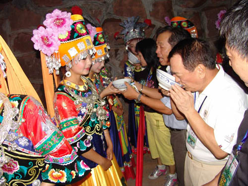 祝賀詞和答謝詞之后,主人把早已想好了的農(nóng)事或家事其日常生活的要事向來客提問,接謝人隨問隨答,然后由族長十分恭敬地雙手舉起盛滿包谷酒的酒杯,遞給一個(gè)年長客人,一碗一碗地讓客人們喝下這香醇美的包谷燒酒。一切儀式做完之后,說聲:“得罪了,最尊貴的客人”,客人答一聲“請不要客氣,我們都是一家人”。這時(shí),酒門大開,攔門人很禮貌地讓開一條道路恭迎客人進(jìn)屋。