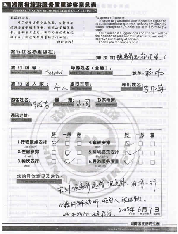 5月下旬,上海張女士一行四位貴賓與湖南西部(張家界)中國國際旅行社工作人員——龔玲取得聯(lián)系,經(jīng)過商談,雙方達(dá)成協(xié)議并簽訂旅游合同,于6月4日抵達(dá)張家界,開始張家界之旅。此次行程是由我社優(yōu)秀導(dǎo)游——褚偉,負(fù)責(zé)旅游接待工作,褚導(dǎo)在旅游過程中講解詳細(xì),客人也很滿意,在意見表上寫到:來到張家界感覺很意外,值得一行,小褚講解動(dòng)聽,吸引人,很幽默!同時(shí)也感謝張女士選擇湖南西部(張家界)中國國際旅行社,以及您對湖南西部國旅的信任與支持。我們會(huì)繼續(xù)努力,做好旅游接待工作。期待下一次與您的合作,祝您愉快!