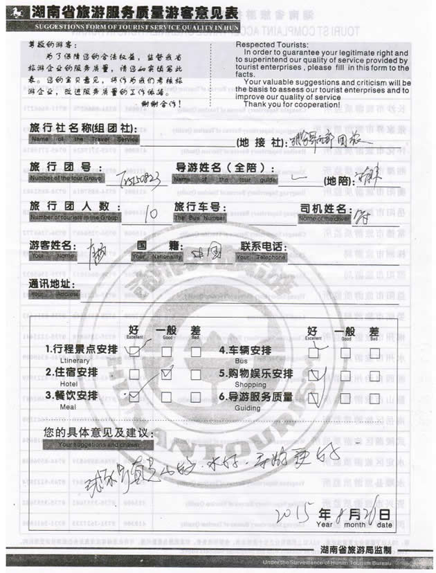 現(xiàn)在位置:首頁(yè) -> 西部國(guó)旅->旅游質(zhì)量反饋 -> 2015-8-23 江蘇肖女士一行10位貴賓 天門(mén)山、張家界、天子山、黃龍洞三日游