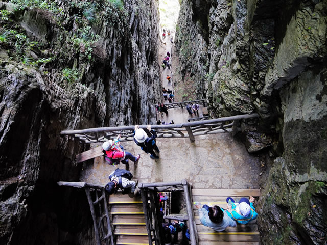 天梯棧道的木板很窄,依次往下延伸,就像一架天梯,把我們送往迷人的仙境。這道“天梯”不是天賜的,而是靠了當(dāng)?shù)氐纳矫瘢道K索,手扶峭壁,肩扛背馱,將這些堅硬而沉重的石頭從山頂一塊一塊地運來、鋪好,鋪成現(xiàn)在這條看似險峻、其實結(jié)實安全的1600多級石階棧道。